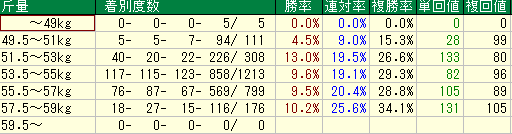 1. 斤量別パフォーマンス分析:重いほど上がる安定感と「52kg付近」の爆発力