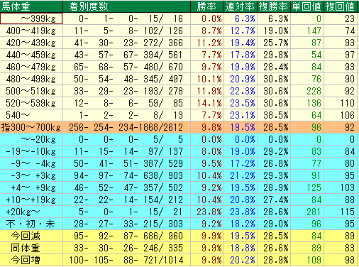 馬体重別の成績を比較すると、馬格が大きくなるにつれて成績が向上する「右肩上がり」の傾向が顕著です。
