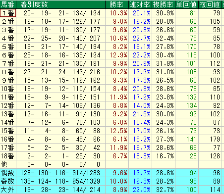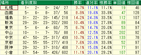 • 複勝回収値 52 複勝率は平均並みですが、回収率が著しく低いです。つまり「人気馬でなんとか馬券内に持ってくるが、穴馬を激走させる期待値はゼロに近い」という状態。馬券的な妙味は極めて薄い距離です。