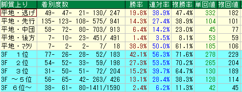 1200mの勝率は 10.9%(単勝回収値102)と非常に優秀。短距離戦においては中途半端な1400mよりも、スピードに特化した1200mの方が、西村騎手の剛腕が活きる結果となっています。