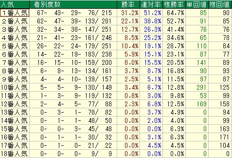 複勝率 37.0% と高く見えますが、単勝回収値はわずか 27 です。つまり「人気馬でなんとか馬券内には持ってくるが、勝ち切る力や人気薄の激走は皆無」という状態。単勝を買う価値は極めて低いです。