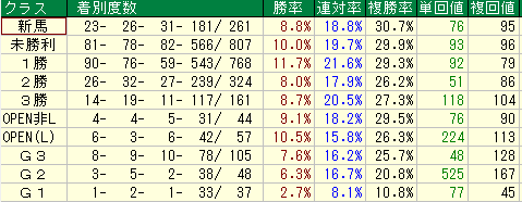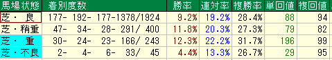 • 複勝回収値:94 最も出走数が多い良馬場では、複勝率が安定しています。複勝回収値も 94 と高く、人気馬であれば素直に軸として信頼できる、非常に堅実なパフォーマンスです。