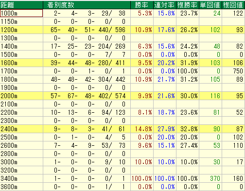 • 2200m:複勝率は平均並みですが、複勝回収値が 52(平均 70)と非常に低く、期待値の低い条件です。