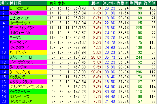 複勝率(安定感)は平均以下だが、一度当たれば特大の配当を運んでくれる、西村騎手の一撃に期待すべき種牡馬です。