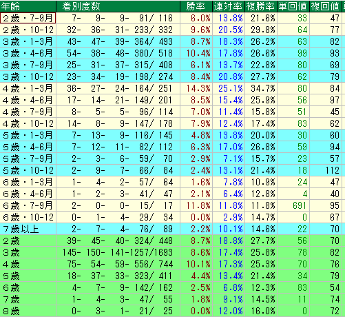 - 5歳以降の急落: 5歳(勝率4.4%)、6歳(勝率2.5%)と、馬の年齢が上がるにつれて成績は顕著に下降します。特に6歳時は複勝率が**12.3%**まで落ち込み、高齢馬のズブさや衰えを補いきれない傾向が見て取れます。
