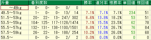 - 勝率は高いが回収値は低い: 勝率10.2%と高い一方で、単勝回収値は53に留まります。これは「58kg前後の斤量を背負う実力馬(=人気馬)」を順当に勝たせているものの、配当的な妙味は少ないことを意味します。この域では穴狙いよりも、順当な軸馬としての評価が妥当です。