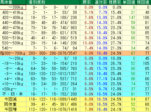 - 399kg以下(勝率0.0% / 複勝率0.0%): 小柄な馬での実績はほぼ皆無です。