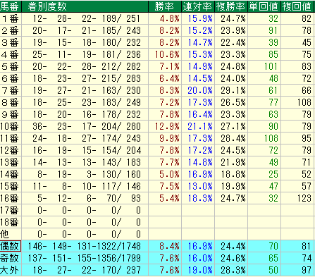 - 主戦場の一つですが、人気に対して着順が伴わないことが多く、コスパが悪い距離です。
