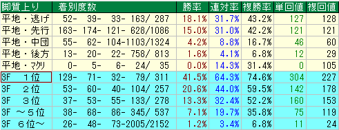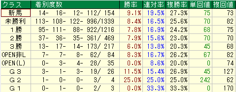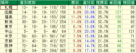 - 複勝率は平均以上だが回収値が低い。過剰人気になりやすく、馬券的妙味に乏しい。