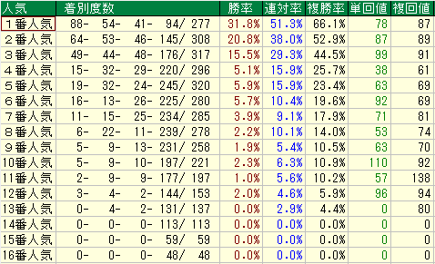 - 複勝率は20%ありますが、人気馬を飛ばしているケースが多く、妙味がありません。