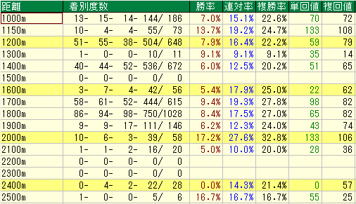 - 2000m: 勝率17.2%(平均8.1%)、複勝率32.8%(平均24.4%)。平均の2倍近い勝率は圧巻です。