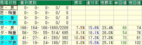 - 良馬場(勝率 7.5% / 複勝率 23.4%): 標準的な成績ですが、これが稍重(勝率 8.1% / 複勝率 26.0%)、**重(勝率 10.5% / 複勝率 27.8%)**と馬場が湿ってスピードが出るようになるにつれて、すべての指標が右肩上がりに上昇しています。