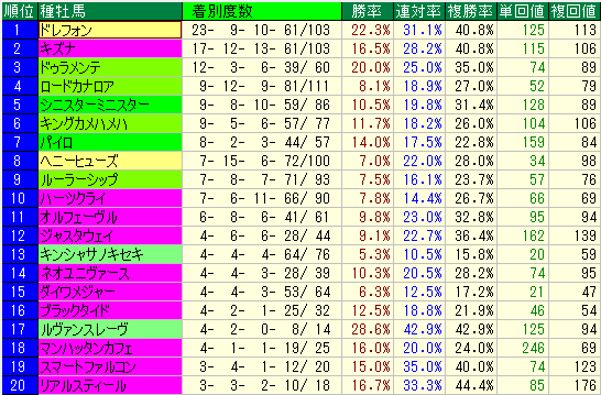 - シニスターミニスター(複勝率31.4% / 単収128 / 複収89) ダートの有力種牡馬ですが、複勝率以上に単勝の期待値が高いのが特徴。人気馬だけでなく、伏兵馬を勝利に導くケースが多く見られます。
