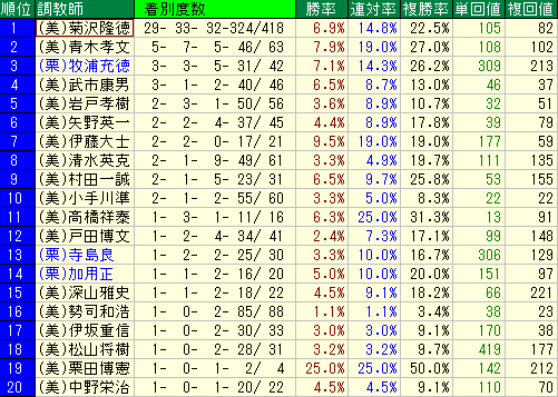 複勝率**【13.0%】**に留まり、回収率が非常に低いです。厩舎の馬質と菊沢騎手のスタイルが合致していない可能性が高く、静観が妥当です。