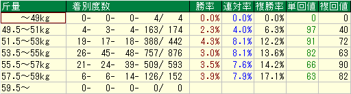 - 分析:51kg以下の複勝率はわずか**【6.3%】**。