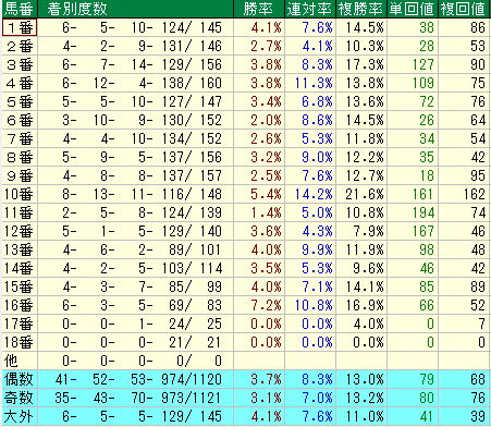 - 評価: 複勝率**【50.0%】、単勝回収値【385】、複勝回収値【120】**。