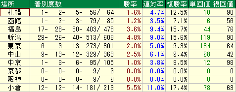 - コメント: 複勝圏内には来ますが、勝率が3.0%しかなく、単勝回収値も22。アタマ固定で買うには最もリスクが高い組み合わせです。