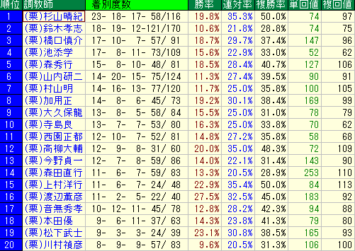 - 💣(栗)杉山晴紀調教師! (複勝率50.0% / 単勝回収値74% / 複勝回収値97%)