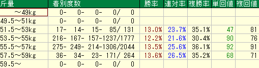 - 複勝率29.2%、単勝回収値53%、複勝回収値55%と、こちらも平均を下回る成績です。