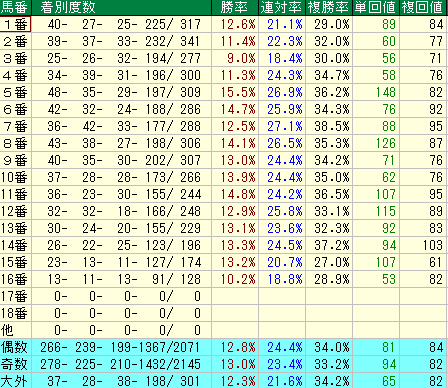 - 単勝回収値86%、複勝回収値71%と回収率も平均レベル。