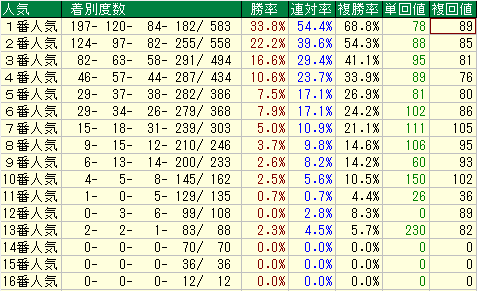 - 複勝率37.1%と好走率は悪くないですが、単勝回収値39%、複勝回収値79%と回収率が低いです。こちらも人気先行に注意が必要です。