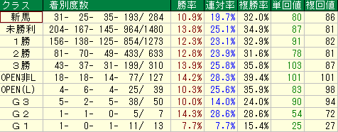- 複勝率33.3%、単勝回収値59%、複勝回収値68%と、いずれも平均を下回る傾向にあります。