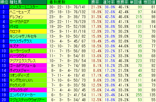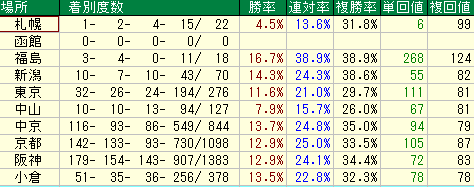 - 複勝率41.1%と好走率は悪くないですが、単勝回収値36%、複勝回収値73%と回収率が低迷。人気になりやすい割に勝ち切れない、というケースが多いようです。馬券的妙味は薄いと言えるでしょう。