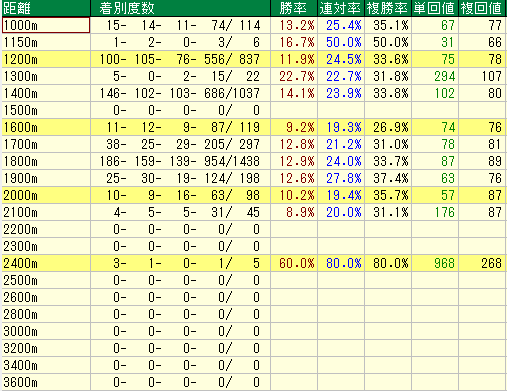 - ⚡︎2000m! (勝率10.2% / 連対率19.4% / 複勝率35.7% / 単勝回収値57% / 複勝回収値87%)