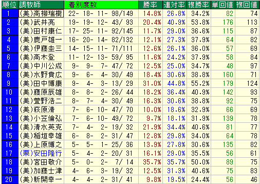 単勝回収値135、複勝率30.6%、複勝回収値82。 こちらも単勝の跳ね上がりが魅力。小笠厩舎同様、人気馬を確実に持ってくるタイプではなく、伏兵を勝利に導く「穴メーカー」としての三浦騎手に期待できるラインです。