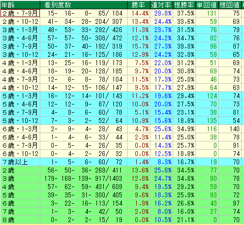 - 「4歳」は軸にはしても、単勝は控えるべし! 期待値が最も低くなる時期。人気馬なら3着付け、中穴なら過信禁物の評価が正解です。