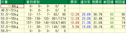 - 単勝回収値84の妙味ゾーン:53.5kg~55kg 最も勝ち星を量産しているのがこの帯域で、単勝回収値も84と高水準です。勝率12.2%という決定力を維持しつつ、回収率も伴っているため、単勝や馬単の「アタマ」として狙い撃つのに最適な条件です。