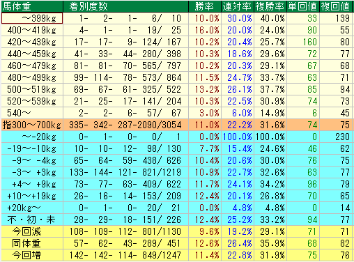 - 穴の狙い目:420~439kg(軽量馬) このゾーンは単勝回収値が160と非常に高く、勝率も10.2%を維持しています。大型馬で安定感を見せる一方で、比較的小柄な馬を先行させての押し切りなど、単勝での破壊力はこちらのゾーンに潜んでいます。