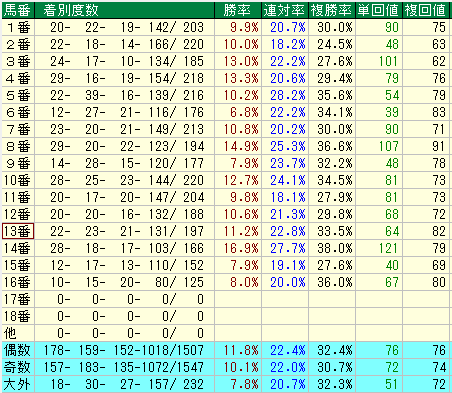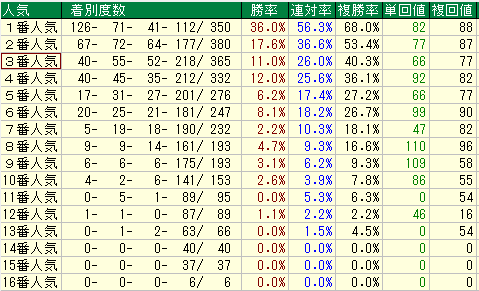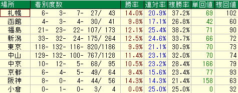 的中率・回収率ともに低迷しており、過信が禁物な競馬場です。