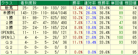 - コメント: 勝率(14.3%)と単勝回収値(158)は高いのですが、複勝率と複勝回収値が低く、非常に「極端」な成績です。勝つか、それ以外(4着以下)かという傾向が強く、軸馬として据えるにはリスクが伴います。