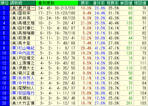 複勝率26.2%、単勝回収値112。 トップ5にも入りましたが、ここでもランクイン。複勝率は決して高くありませんが、勝つ時の配当が非常に良く、単勝を少額握っておくだけで収支をプラスに持っていける可能性を秘めています。