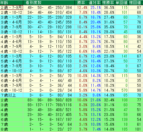 - 4歳時のスランプデータ 4歳時の複勝率は21.5%、単勝回収値は47まで急落します。この時期は条件戦からオープン、重賞とクラスが厳しくなり、乗り替わりが発生しやすいことも影響していると考えられます。特に4歳夏の複勝率18.5%は、三浦騎手にとっての「鬼門」と言えます。