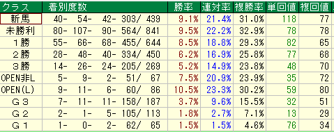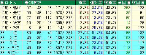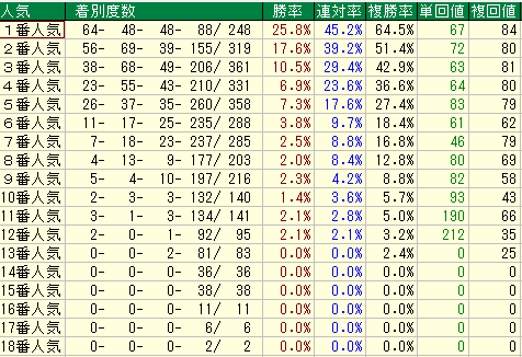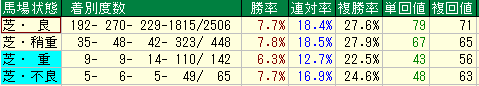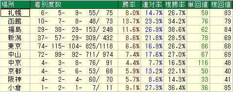 - コメント: わずかではありますが、平均データを下回っています。複勝回収値40は非常に低く、人気馬を飛ばすケースが多いことを示唆しています。