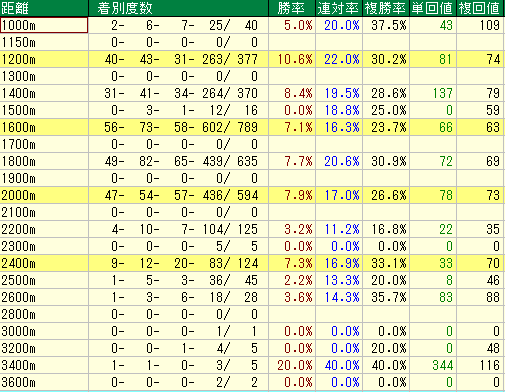 - 分析: 1500mは札幌や小倉などのローカルで組まれますが、勝ち星がありません。連対率は悪くないですが、決定力不足が目立つデータとなっています。