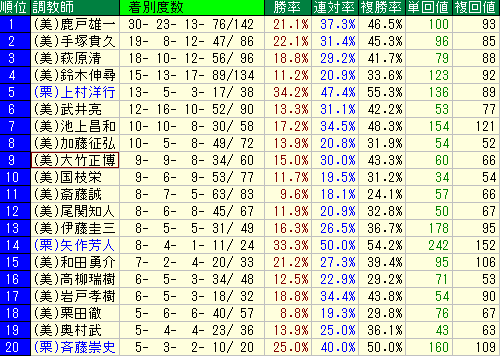- コメント: 複勝率も低く、回収値も振るいません。このコンビで人気を集める馬がいたとしても、手は出しにくい「危険なコンビ」の一つです。