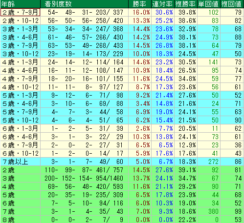 - 「4歳・1-3月」は単勝回収値141%、複勝率30.5%と回収率が非常に高く、見逃せません。