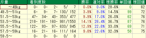 - コメント: 53.5~55kgに次ぐ好走率で、信頼度は非常に高いです。やや重い斤量でもしっかりと結果を出しており、安定感があります。
