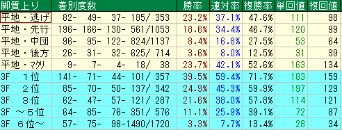 - コメント: 複勝率こそ悪くないものの、回収率、特に単勝回収値が低いことから、人気で飛びやすい傾向にあると考えられます。