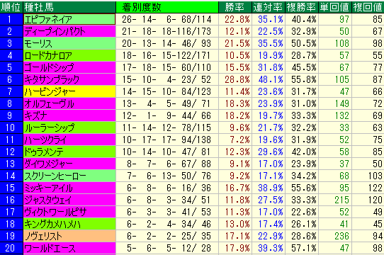 - コメント: 複勝率の高さに加え、複勝回収値が100%を超えるのは魅力的!人気薄でも馬券に絡むケースが多く、「高配当」を演出する可能性を秘めた「穴狙い血統」としてマークすべきです!