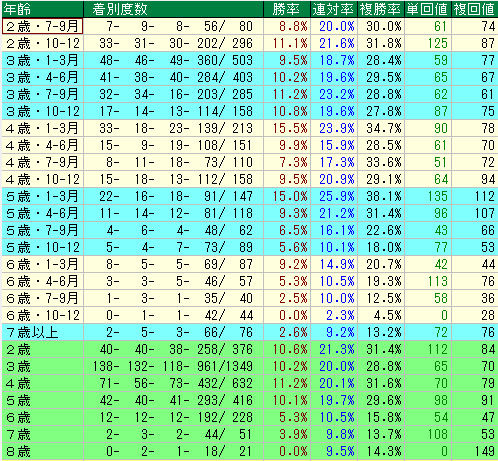 - 考察: 5歳まで10%前後をキープしていた勝率が、6歳になると半分近くまで急落します。特に下半期(10-12月)は勝率 0% となっており、高齢馬を勝ち切らせるには厳しい現実がデータに表れています。