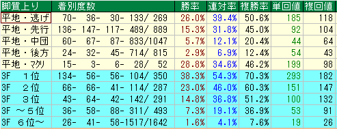 - コメント: 回収率のバランスを見ると、良馬場と重馬場で単勝回収値が80を超えています。特に重馬場は複勝率が低い一方で単勝回収値が高いため、「来る時は勝つ」という極端な狙い方が面白い条件です。