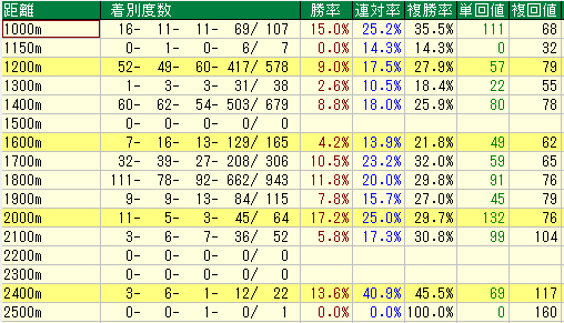 - コメント: 複勝率は平均以上(21.8%)ありますが、回収率が非常に低いです。つまり「人気馬を3着以内に持ってくるが、期待値は低い」という状態で、投資対象としては魅力に欠ける距離です。