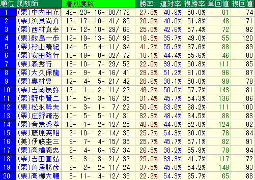 第1位:(栗)角居勝彦調教師 複勝率は54.2%と中堅ですが、単勝回収率は149、複勝回収率も93。川田騎手のイメージを覆すほどの大物食いや、人気薄での勝利が期待できる「一発」の魅力に溢れたタッグです。
