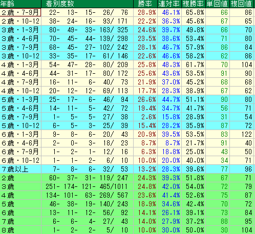 - 2歳(複勝率51.8%)、3歳(54.0%)、4歳(52.6%)と、この3年間は常に複勝率5割を超えています。