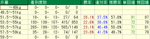 ボリュームゾーンとなる54kg〜57kg帯では極めて安定した成績を残していますが、馬券的な「妙味」は両端に分かれています。