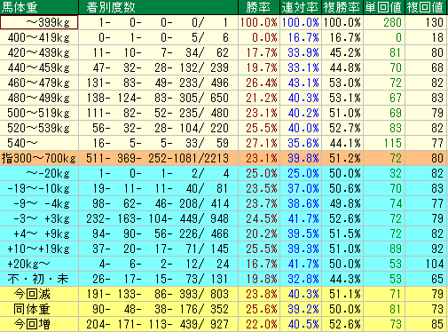 もっとも成績が良い馬体重:460kg~479kg & 540kg以上